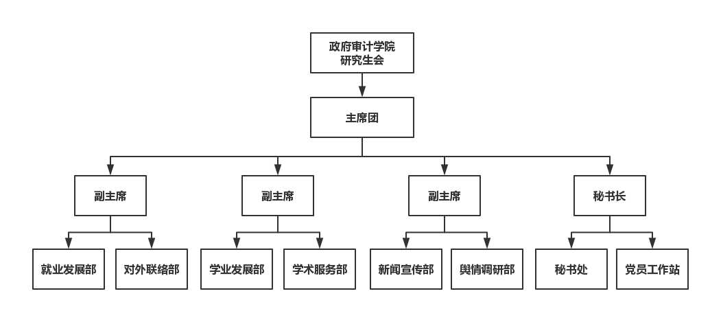 政府审计学院研究生会主席团设五人,由一位主席,一位秘书长和三位副主席组成,各部门具体职能参见《政府审计学院研究生会章程》。