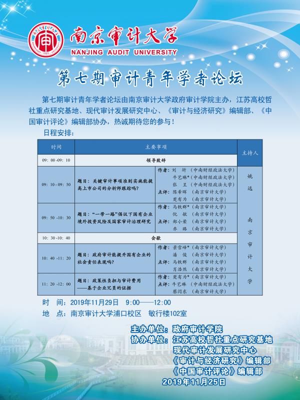 第七期审计青年学者论坛,第七期审计青年学者论坛有williamhill中国政府审计学院主办,江苏高校哲社重点研究基地、现代审计发展研究中心、《审计与经济研究》编辑部、《中国审计评论》