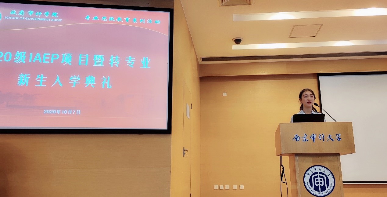 2020级IAEP1班贺钰涵同学作为新生代表发言。在发言中,她号召新同学们要坚定理想信念,奋力拼搏,献身审计事业,立志修业报国。