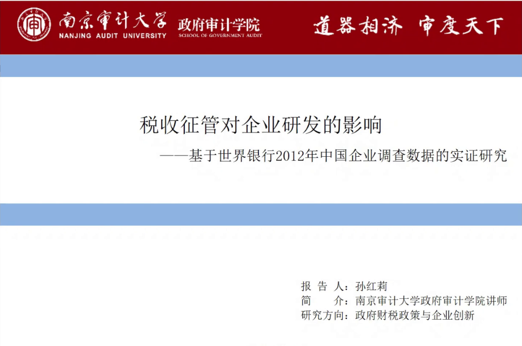 第四部分为结论与政策建议,文章指出税收征管通过提高企业信息透明度和外源融资能力,显著提高企业研发倾向和研发强度,显著促进企业协同研发,而税收征管力度加大所导致的研发投入的增加很有可能是企业的一种研发操纵行为。据此,孙老师指出,要进一步发挥税务部门集聚资源和治理职能作用,减低地方政府对税务部门征管活动的干扰,进一步降低企业税收负担,着手解决企业研发活动的融资约束问题,进一步引导不同形式的企业研发创新。