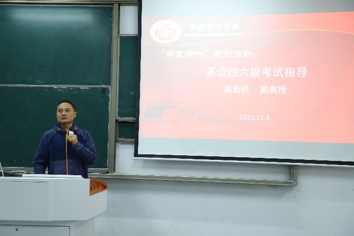 为帮助学生更好地备战四六级考试,提高英语水平, 11月3日,政府审计学院特邀请外国语学院吴新民副教授在竞秀楼N107为同学们开展一场关于英语四六级作文备考策略讲座。