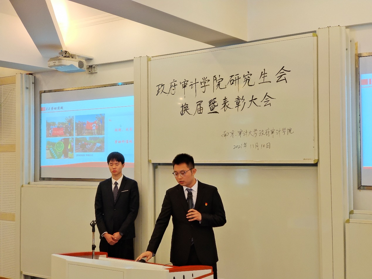 本次换届表彰大会由第四届政府审计学院研究生会文体部部长助理周为主持。