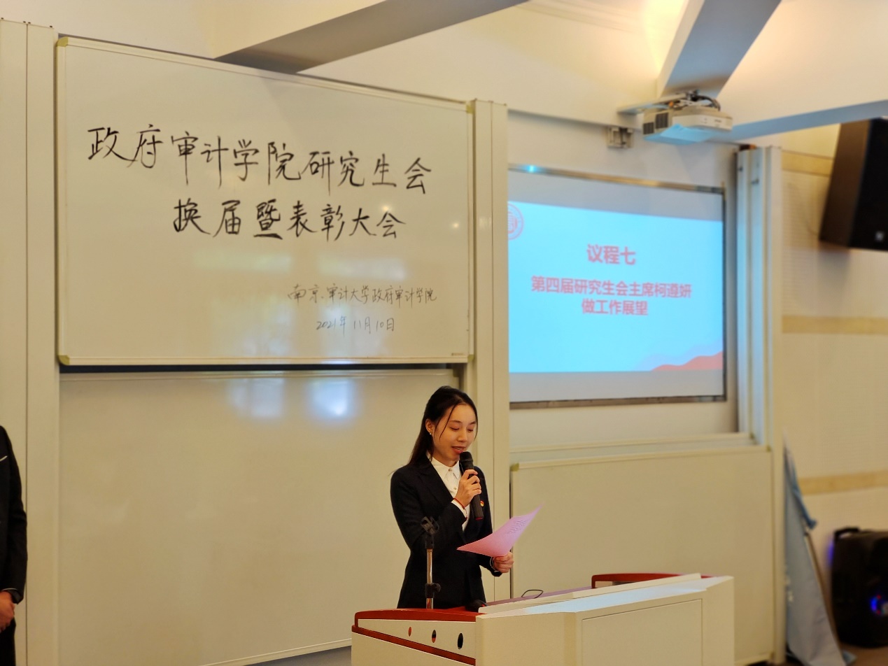 第四届政府审计学院研究生会主席柯遵妍做工作展望。柯遵妍表示,研究生会作为学院的基层组织,其工作贯穿于学院的整体运作与同学的全面发展之中。在过去的一年,研会不断创新,开创了独具自身特色的系列活动,收获颇丰。新的一年,她也会带领新一届研会成员不断完善研会体制机制,推动研会工作发展,并在传承特色系列活动的基础上创新发展,进一步突显学院特色,彰显学院及研会风采。展望的最后,她也提到,希望研会成员都能够做到触类旁通,勇于挑战,敢于创新,推动研会朝着更好的方向发展,并在其中获得成长与收获。