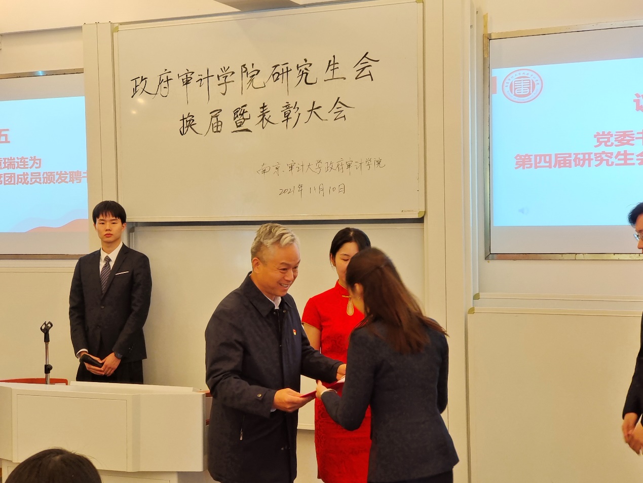 学科办主任吴雪莹宣读《关于聘任政府审计学院第四届研究生会主席团的决定》。