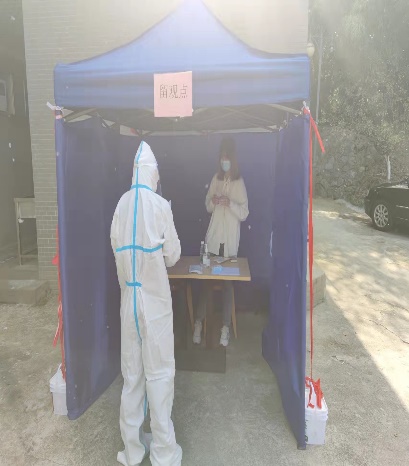 14点45分,我院一名研究生被随机抽中演练新冠阳性患者,学院立刻启动紧急预案。辅导员余飞接到研究生院电话通知后,立即联系该生,指导其前往最近的留观点,并通知全院其他研究生立即回到宿舍封闭隔离,初步消杀。随后该辅导员着防护服前往留观点,收集演练患者健康状况,近期行程等信息,并指导其使用核酸检测试剂自测,安抚演练患者情绪,等待学校疫情防控专组进行转运。