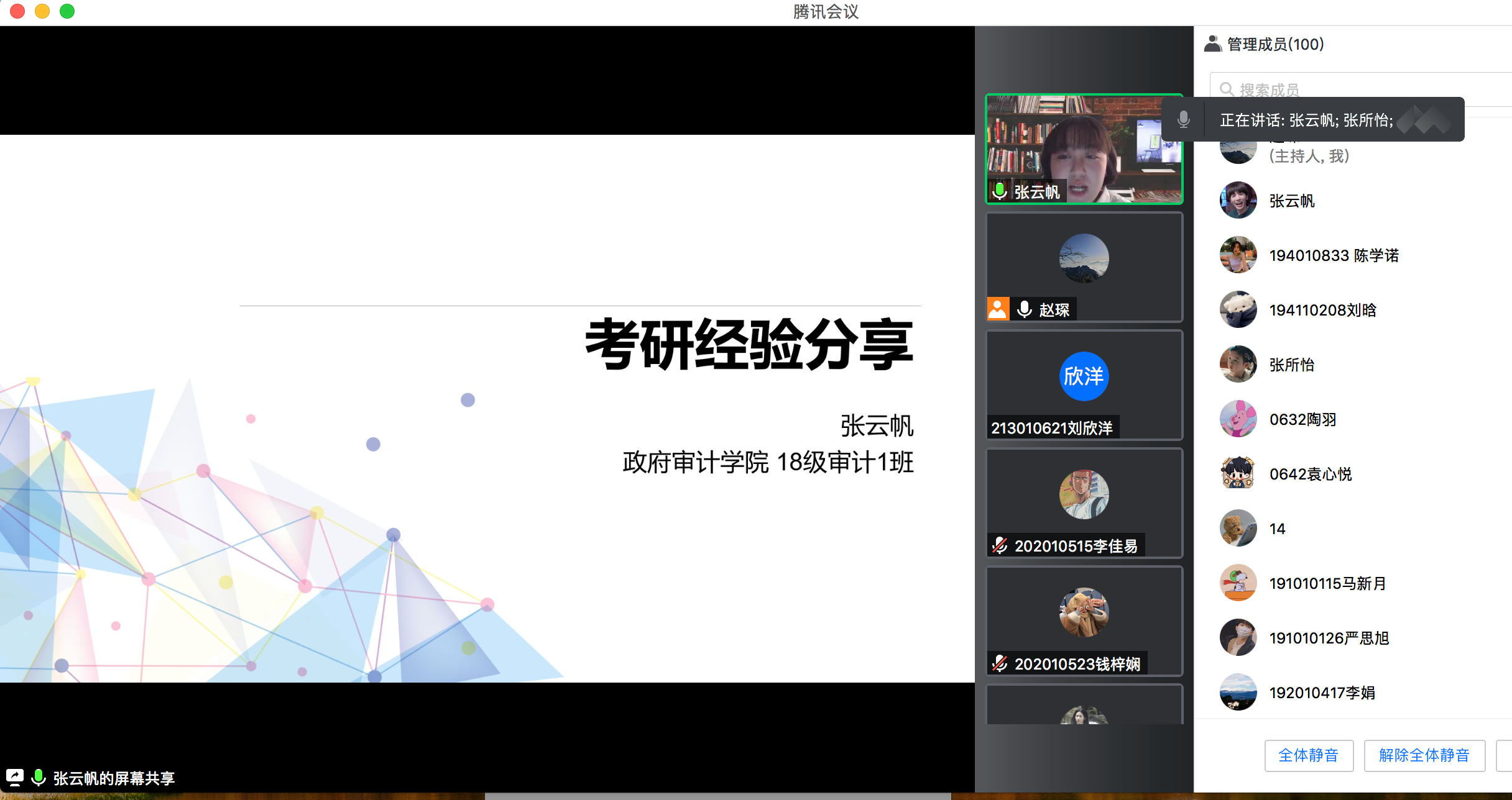 为使政府审计学院学子们对考研有更深入了解,帮助同学们树立正确奋斗目标,有效提升竞争力。4月20日下午,学院20级审计5班、20级审计7班、21级审计6班联合线上举办“考研经验交流分享会”活动,活动邀请我校考取西南财经大学审计专硕的张云帆、williamhill中国审计专硕的单炳霖、上海财经大学金融专硕的杨宇曦、对外经济贸易大学金融专硕的方珊珊四位同学分享交流。会议也吸引了其他年级共100余名同学参与。活动由21级审计6班专业班主任赵琛老师主持。
