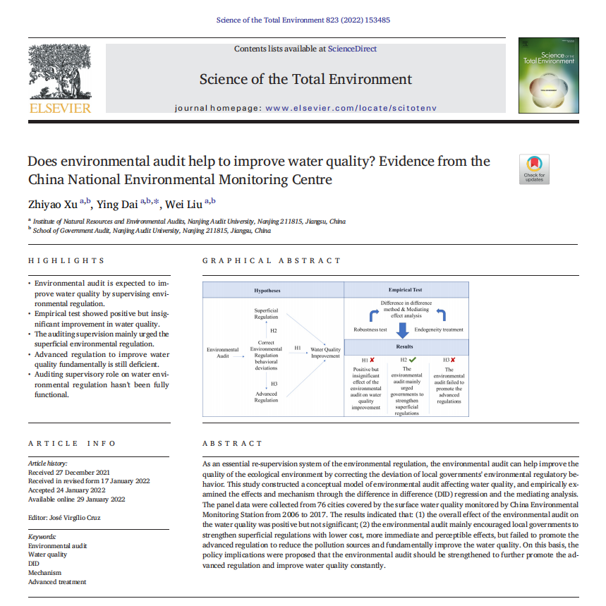由徐志耀副教授第一作者、戴莹博士唯一通讯作者的论文“Does Environmental Audit Help to Improve Water Quality? Evidence from the China National Environmental Monitoring Centre”发表在国际顶级期刊《Science of the Total Environment》(荷兰)2022年第823卷第153485页。该刊创立于1972年,是环境科学与生态学领域公认的国际顶级期刊,科睿唯安SCI分区为Q1、中科院SCI分区为Q1,2020年影响因子为7.963。该刊物主要发表环境与生态类跨学科相关研究成果,这是该刊物自创刊以来首次发表政府审计和环境审计主题的学术论文。该论文创新性构建了环境审计影响水环境质量的完整因果关系链,基于年度地级市地表水质量面板数据、使用双重差分方法,实证检验了我国近十多年来国家层面开展的环境审计行动影响地表水质量的整体效应与作用路径。基准回归结果表明,国家环境审计对水质量的作用为正,但尚不显著;作用路径分析则表明,国家环境审计促进了河道整治和生活性污染源治理、显著助力提升了水体溶解氧浓度,但对生产性污染源治理和化学需氧量、氨氮等深度污染物的作用不显著。由此,提出一方面要进一步加强国家环境审计的广度、深度、力度和频度,形成足够的国家审计威慑力;另一方面要把国家环境审计结果作为地方官员考核、奖惩和提拔的关键指标,提高违法违规的成本,从根本上改变地方政府的行动决策函数。