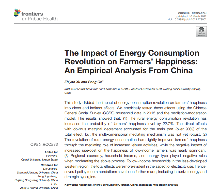 由徐志耀副教授第一作者、葛蓉博士唯一通讯作者的论文“The Impact of Energy Consumption Revolution on Farmers’ Happiness: An Empirical Analysis From China”发表在国际权威期刊《Frontiers in Public Health》(瑞士)2022年第10卷(March 10)。该刊物是SCI和SSCI双索引期刊,当前科睿唯安SSCI分区为Q1,近五年平均影响因子为4.022,主要发表公共环境与职业健康类跨学科研究成果。该论文创新性研究了我国农村能源革命中的需求端问题,探讨了加快推进农村能源消费革命、有力支撑乡村振兴战略的实现路径。论文首先将能源消费革命对农民幸福感的影响划分为直接效应和间接效应,然后利用2015年中国人民大学CGSS全国农户调查数据、使用有序概率回归方法对以上效应进行了实证检验。结果表明:(1)农村能源消费革命能显著提升了农民幸福感,但直接效应占主要部分、且边际递减趋势明显;(2)农村能源消费革命通过增进休闲发挥了中介作用、小幅提升了农民幸福感,但使用成本增加对低收入农民幸福感的消极影响已接近显著;(3)区域经济、家庭收入和能源类型在以上过程起到了负向调节作用,西部地区、低收入家庭和电能使用的总体效应更为显著。由此,论文提出了实施面向欠发达地区和低收入人群的普惠能源、面向总体目标实现的多战略协同等推进农村能源消费革命的若干政策建议。