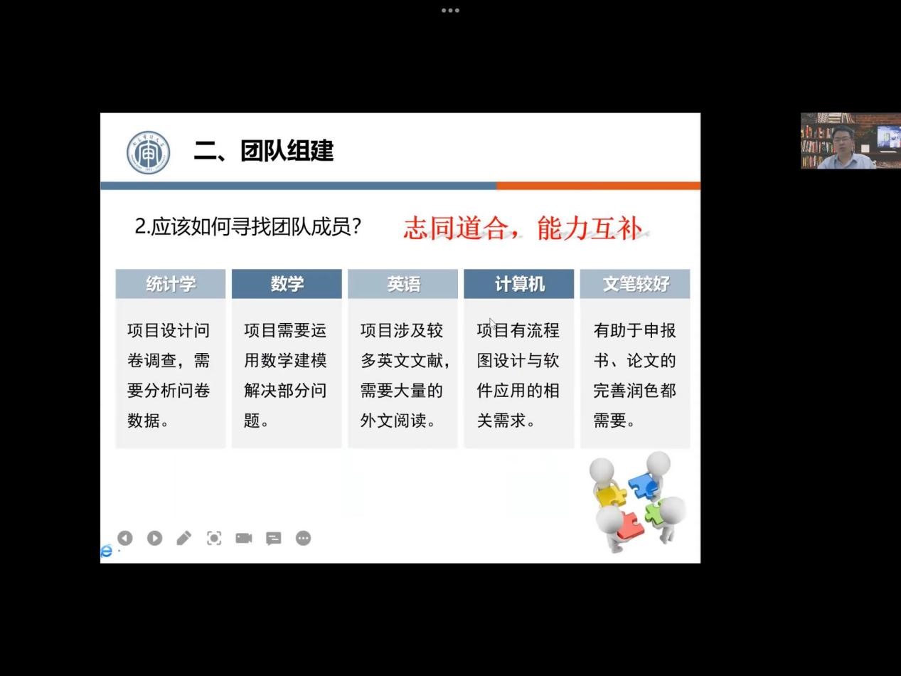 54日下午,政府审计学院通过线上会议形式开展“师友同行”系列讲座——如何做好大创申报。本次讲座的主讲人是澄园书院院长樊士德教授。樊院长是中国社会科学院经济学博士,南京大学商学院博士后,硕士生导师,学科带头人,美国Boston University访问学者,担任全国博弈论与实验经济学研究会常务理事,先后主持国家社科基金项目等国家级、省部级重大和重点各类项目40余项,在《中国工业经济》等报刊发表论文80余篇,获得省部级等各类奖项50余项。先后入选江苏高校“青蓝工程”优秀教学团队带头人、江苏高校“青蓝工程”中青年学术带头人、江苏省第四期和第五期“333工程高层次人才”中青年科学技术带头人、首批“江苏青年社科英才”等。