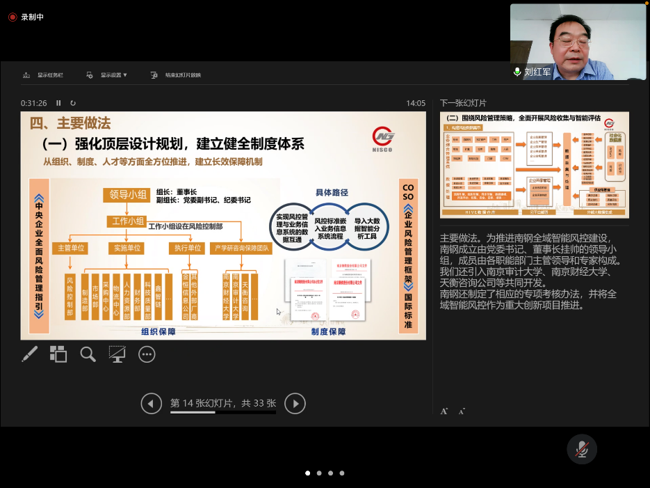 5月8日下午,政府审计学院通过线上会议的形式开展了“师友同行”系列第四十四期主题讲座——智慧风控审计平台建设探索与实践。本次讲座主讲嘉宾是南京钢铁股份有限公司监事刘红军部长。刘红军是国际内部控制协会的高级国际内部注册控制师、国际反舞弊协会的国际注册反舞弊师;2009年-2019年,先后担任南钢联合有限公司纪检监察主任、廉政监察部负责人;2019年至今,任南钢联合有限公司风险控制部负责人。
