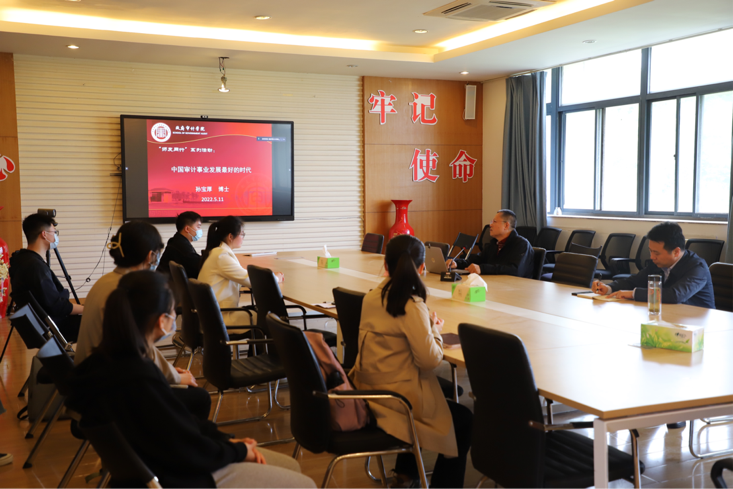 5月11日下午,政府审计学院通过线上线下相结合的方式开展了第四十五期“师友同行”主题讲座——“中国审计事业发展最好的时代”。本次讲座由中国审计学会会长孙宝厚博士主讲,21级审计7班田的同学主持,副院长李兆东以及学院150多名师生代表聆听讲座。