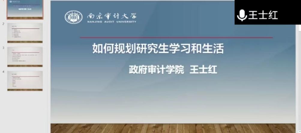 为增强2022级审计硕士新生对研究生学业生活的了解,8月19日下午,政府审计学院执行院长王士红教授受邀开展“2022级审计硕士暑期系列学术讲座”之“如何规划研究生学习和生活”主题讲座。讲座由政府审计学院副院长刘静主持,2022级全体研究生线上聆听。