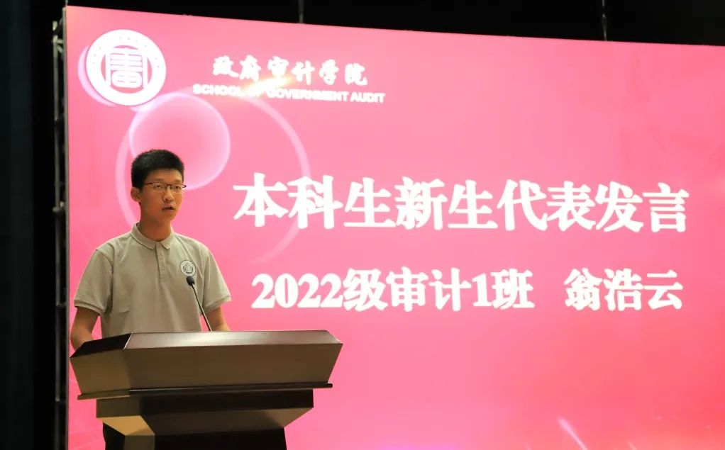 2022级审计1班翁浩云同学代表本科生新生发言。他回首军训的美好时光,总结了军训于学生生活与学习的意义,并以“凡所过往,皆为序章”激励同学们忘却过去或失意或欢乐的日子,共同展望在南审的崭新未来。