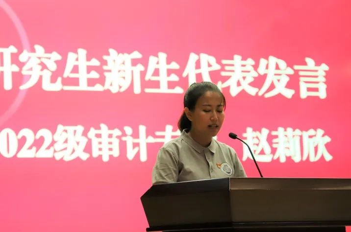 2022级审计专硕赵莉欣同学代表研究生新生发言。她讲述了跨专业考研的心路历程,回顾了考研时的孤独与艰辛,无数次的挑灯夜读换来了今日的硕果累累。作为一名新审计人,她对今后的校园生活做出规划,并以院训“道器相济,审度天下”与大家共勉。